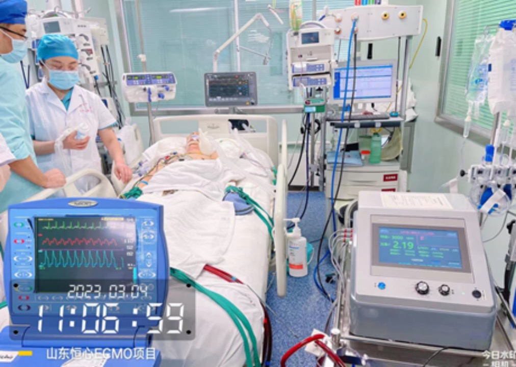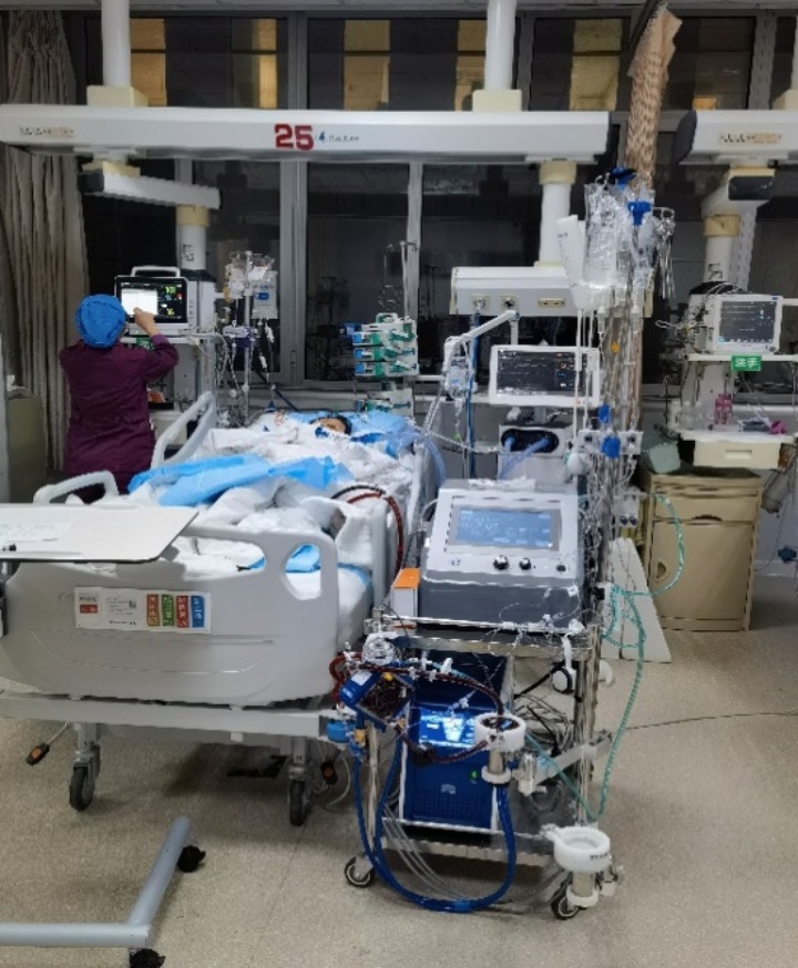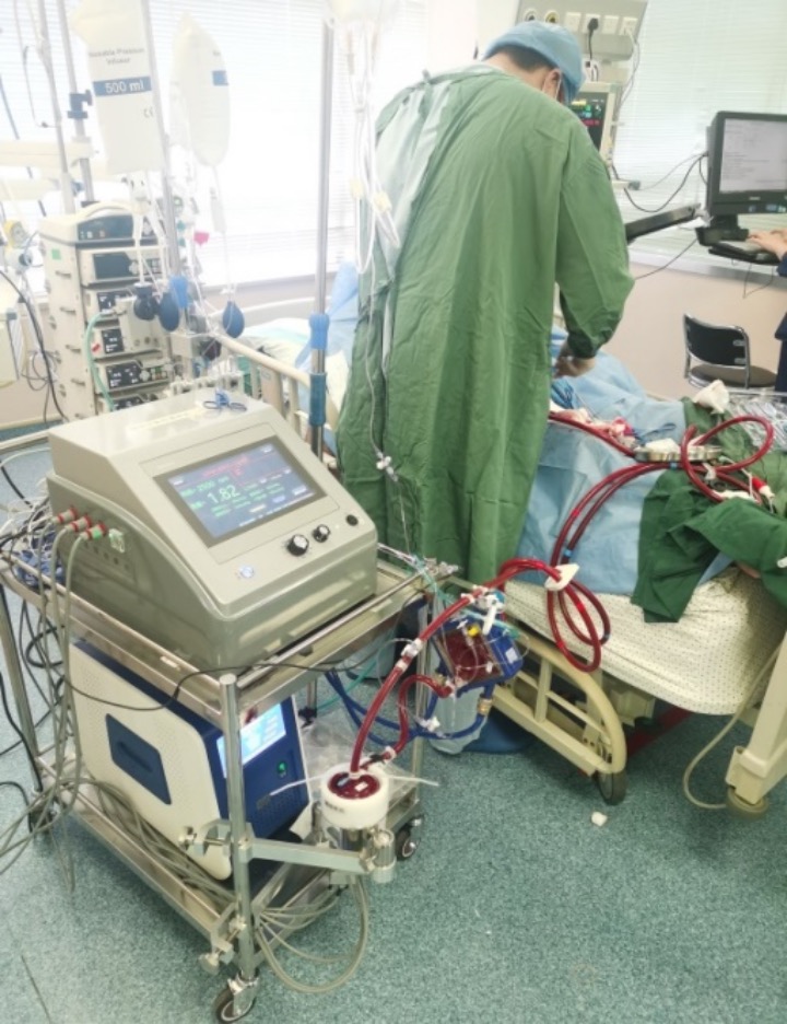 體外心肺支持輔助設(shè)備(ECMO),解決了“卡脖子”技術(shù), 這一高端醫(yī)療器械已成為危重癥和急救醫(yī)學(xué)領(lǐng)域里最具代表性的治療手段,成為急危重癥搶救領(lǐng)域的一個(gè)重要技術(shù)突破,代表了一個(gè)國(guó)家危重癥急救技術(shù)水平。本成果已經(jīng)完成臨床試驗(yàn)。圖1和圖2是我們研發(fā)的ECMO在進(jìn)行臨床試驗(yàn)。