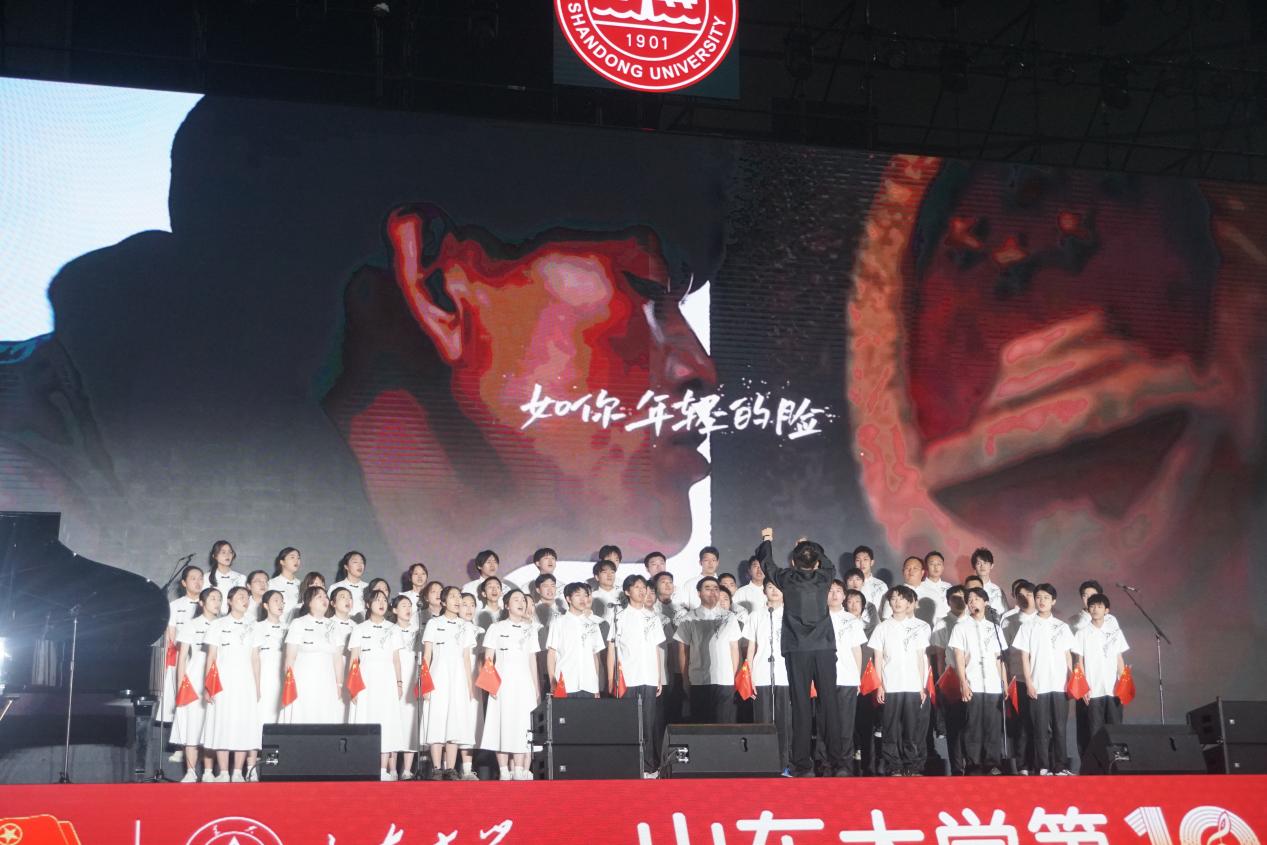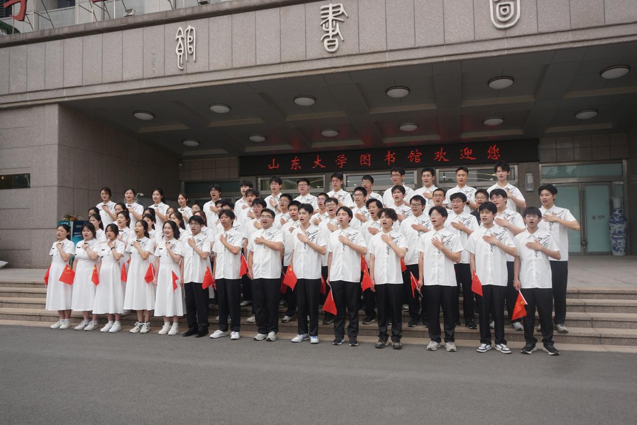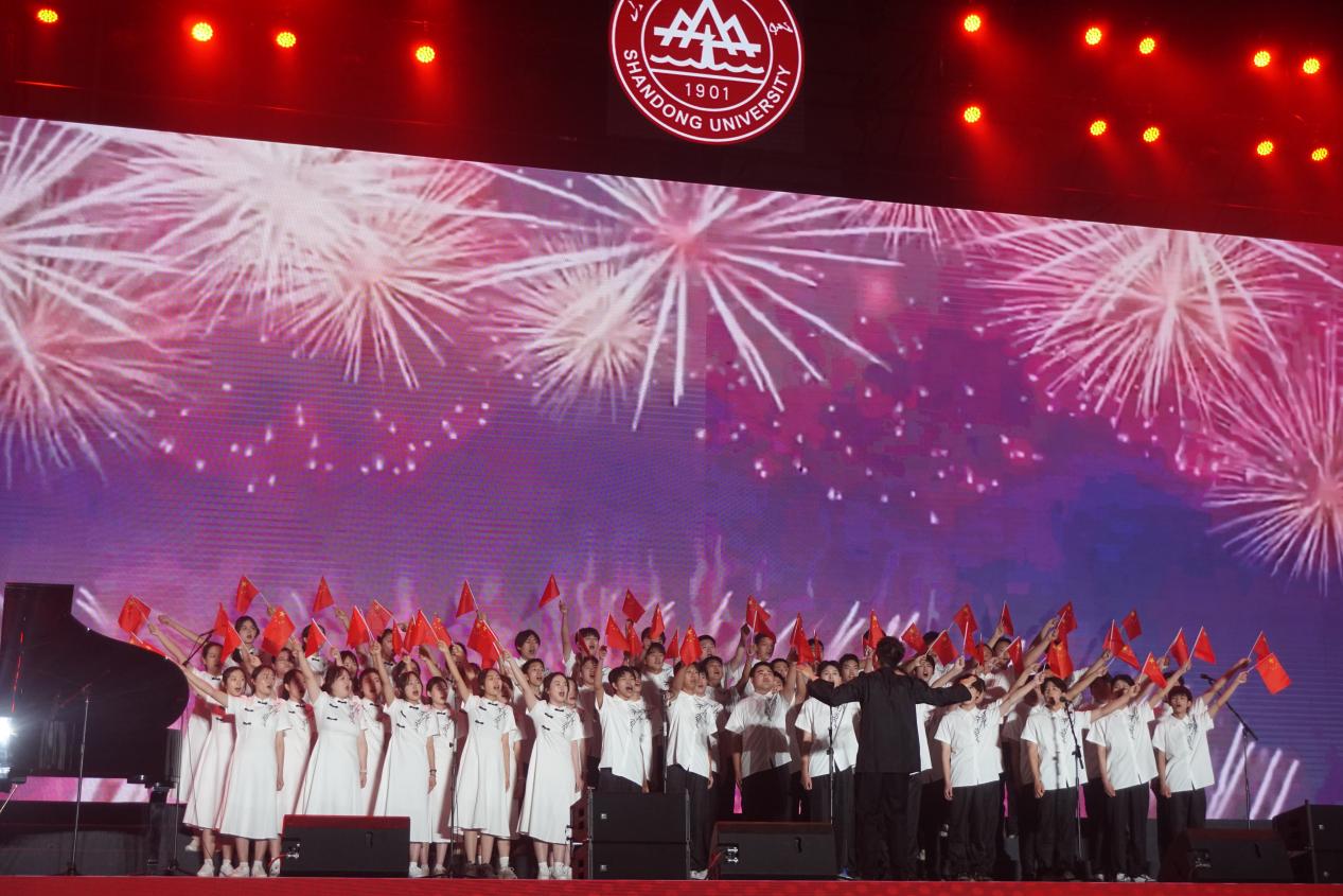 活動伊始,在來自山東大學各學院的老師和同學們的領唱下,全體師生齊唱《我愛你中國》。電氣之聲合唱團每位成員搖動手中的紅旗,歌聲嘹亮,表達對祖國發(fā)自內心的愛。