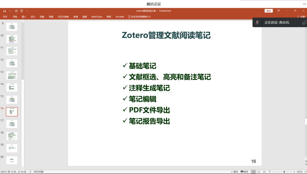 第五講“Zotero文獻管理軟件的使用”于1月13日舉行,為了增強研究生在團隊發(fā)展中的參與感、成就感和歸屬感,邀請2023屆碩士畢業(yè)生高志民以Zotero為例,介紹了文獻管理工具在文獻獲取、參考引用及筆記管理等方面的作用,并結合常用場景演示了軟件常用功能和技巧,提升了課題組同學對學術工具的認知。