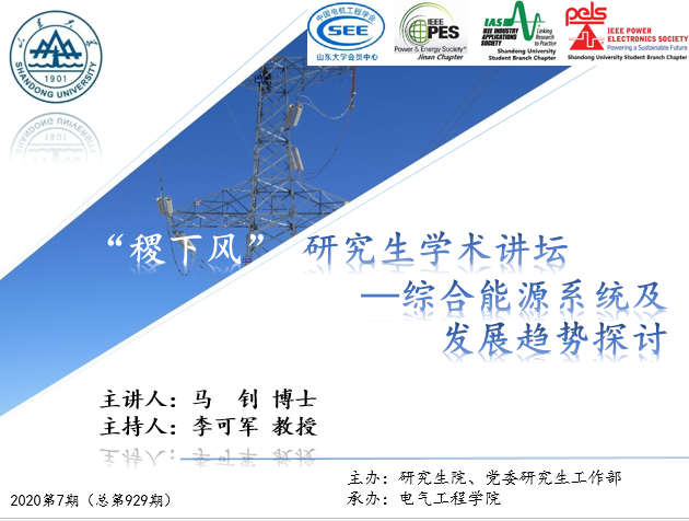 2020年5月12日下午2點,由山東大學(xué)研究生院、黨委研究生工作部主辦,電氣工程學(xué)院承辦的2020年第7期(總第929期)“稷下風(fēng)”研究生學(xué)術(shù)講壇通過騰訊會議平臺成功舉辦。本期講壇主講嘉賓為馬釗博士,講座的主題為“綜合能源系統(tǒng)及發(fā)展趨勢探討”。本次講壇由李可軍教授主持。