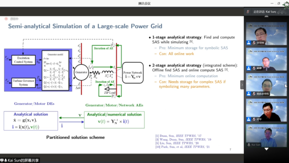 隨后,美國(guó)田納西大學(xué)孫凱教授做了“Faster-Than-Real-Time Stability Assessment and Control for a More Resilient Power Grid”為主題的報(bào)告,分享了其課題組在近5年在基于半解析方法的大規(guī)模電力系統(tǒng)暫態(tài)穩(wěn)定超實(shí)時(shí)仿真技術(shù)和基于非線(xiàn)性模態(tài)分解的暫態(tài)穩(wěn)定性分析方面的取得的一系列理論成果。半解析方法,可以實(shí)現(xiàn)大步長(zhǎng)暫態(tài)穩(wěn)定仿真和10-100倍的加速比;非線(xiàn)性模態(tài)分解,可以實(shí)現(xiàn)小干擾穩(wěn)定和暫態(tài)穩(wěn)定性在統(tǒng)一框架下的分析。
