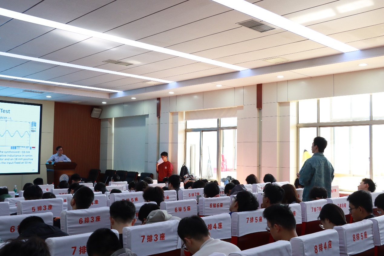 講座主要圍繞著負(fù)值電抗的原理、應(yīng)用與未來實(shí)現(xiàn)方法三個(gè)部分展開。首先謝教授引入負(fù)值電抗這種新興的電路元件概念,它具有與普通電感相反的特性,即電感值為負(fù),必須通過合成來實(shí)現(xiàn),這種負(fù)值電感可以用于消除電路中不必要的電感效應(yīng),從而進(jìn)行有效的補(bǔ)償和控制系統(tǒng)的優(yōu)化,在電力系統(tǒng)中,負(fù)值電抗能夠顯著提高系統(tǒng)的效率、經(jīng)濟(jì)性和可靠性,例如,負(fù)值電抗可以用來抵消系統(tǒng)中的正電感,從而減少無功功率的需求,降低傳輸損耗并改善功率因數(shù)。通過引入負(fù)值電抗,系統(tǒng)能夠有效地平衡無功功率,減輕對傳統(tǒng)補(bǔ)償設(shè)備的依賴,進(jìn)而實(shí)現(xiàn)更高效的電力傳輸和穩(wěn)定的運(yùn)行狀態(tài);其次,負(fù)值電抗在無線電力傳輸、電磁兼容性、可調(diào)濾波器、天線設(shè)計(jì)和波導(dǎo)設(shè)計(jì)等領(lǐng)域具有廣泛的潛在應(yīng)用。例如,在無線電力傳輸中,負(fù)電感可以用于抵消漏電感,改善電力傳輸?shù)娜萘亢托剩辉谔炀€設(shè)計(jì)中,負(fù)值電抗可用于天線的調(diào)諧,提供更緊湊、更高效的設(shè)計(jì),同時(shí)提升輻射特性和調(diào)諧能力;在波導(dǎo)設(shè)計(jì)中,負(fù)電感有助于無線通信系統(tǒng)擴(kuò)大頻率范圍,提高頻率的穩(wěn)定性。