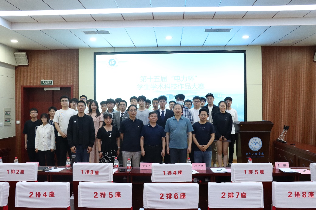 比賽結(jié)束后,評委老師和同學(xué)們合影留念。至此,第十五屆“電力杯”學(xué)生學(xué)術(shù)科創(chuàng)作品大賽成功落下帷幕。