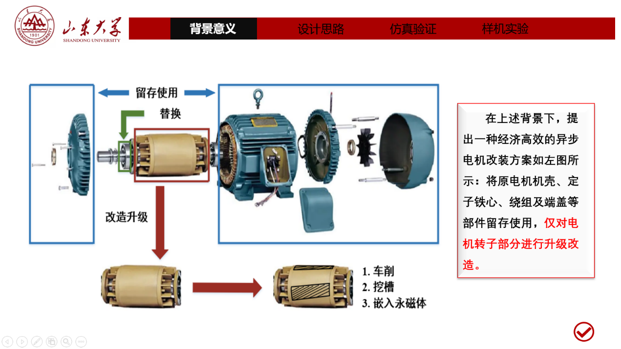 本作品以小型感應(yīng)電機進行改造試制,將異步電機修正為異步起動永磁同步電機,即在鼠籠轉(zhuǎn)子條上切割磁極槽加裝表貼式永磁體;通過Ansys電磁仿真計算輸出性能例如起動轉(zhuǎn)矩、起動電流、相電流、反電勢、磁密分布、額定工況下的額定效率、額定功率因數(shù)等;通過電機廠實際加工出的樣機測量提取實測參數(shù),進行輸出性能與額定運行性能的驗證。與感應(yīng)電動機相比,將本作品應(yīng)用于抽油機,結(jié)合上述功能簡介中的優(yōu)點,可量產(chǎn)永磁化改造的異步起動永磁同步電機,代替?zhèn)鹘y(tǒng)低性能異步電機,實現(xiàn)真正意義上的油田開采工作的節(jié)電省錢、高效工作的高性能電機。