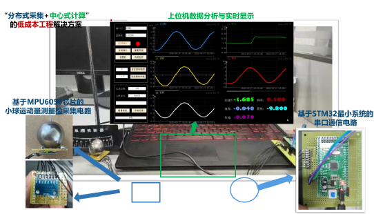 本作品通過MPU6050芯片實時采集擺球運動X軸、Z軸加速度Accx和Accz以及X、Y、Z軸姿態(tài)角Pitch、Roll、Yaw;根據(jù)實時測得的數(shù)據(jù)以及數(shù)學(xué)物理建模,建立Y軸姿態(tài)角Roll與擺球擺動角θ的映射關(guān)系;根據(jù)角θ,通過三角函數(shù)公式計算擺球位移X;通過加速度Accx積分計算擺球切線速度Vx;通過識別搖擺角曲線極點獲取擺球擺動頻率f;通過GUI界面將擺球運動數(shù)據(jù)進行可視化展示,具體顯示各項指標(biāo)的數(shù)值大小以及時間變化曲線。本作品以較少的實測數(shù)據(jù)實現(xiàn)擺球多維運動狀態(tài)的監(jiān)測,并達到了較高的準確性與較少的計算量,且實現(xiàn)擺球運動狀態(tài)的實時顯示與數(shù)據(jù)記錄,具有重要現(xiàn)實意義。