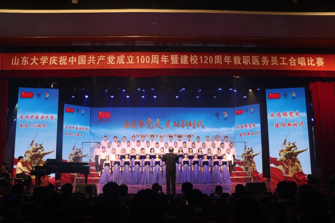 薪火相傳百年路,以歌敘史頌黨恩。為慶祝中國共產(chǎn)黨成立100周年暨山東大學建校120周年,由校工會、婦委會舉辦的以“永遠跟黨走 建功新時代”為主題的教職醫(yī)務(wù)員工合唱比賽于6月28-29日在中心校區(qū)音樂廳舉行,決賽在威海、青島校區(qū)設(shè)視頻分會場。學院黨委精心組織56名教師組成教職工合唱團,以一首《紅色印記》重溫革命歷程,凝聚奮進力量。學院合唱團曲目編排新穎,歌聲蕩氣回腸,在預賽61支隊伍中脫穎而出獲得第八名闖入決賽,在決賽中,學院合唱團戮力同心,表現(xiàn)優(yōu)異,榮獲三等獎。