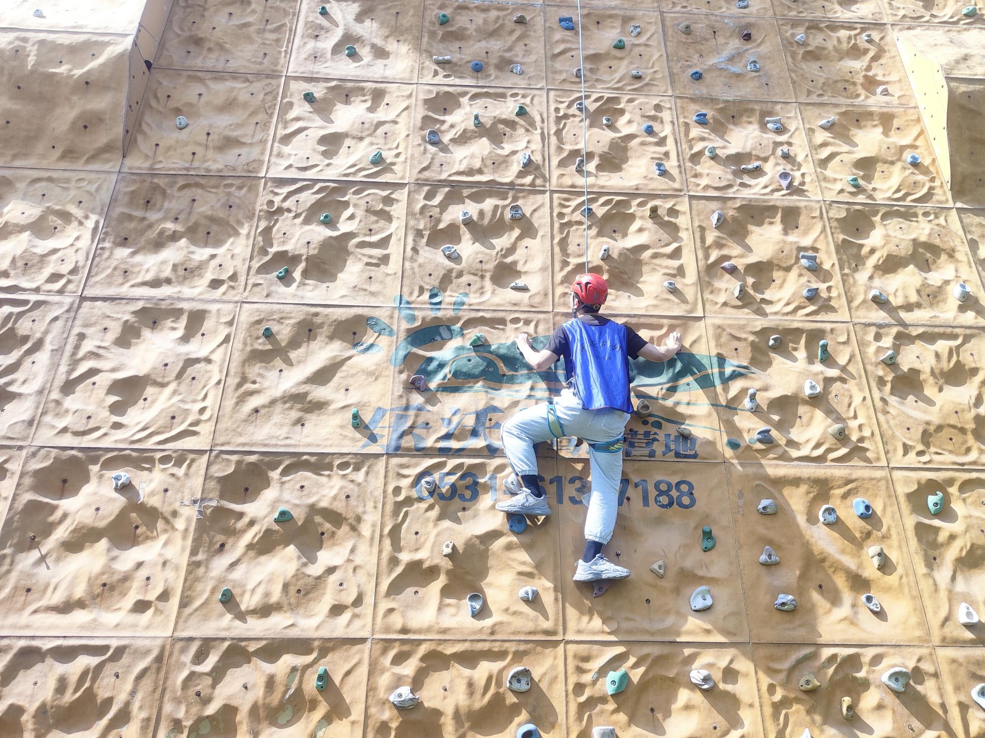 接著開始第一個(gè)項(xiàng)目——“巖壁芭蕾”。在每位成員攀巖的過程中,其他成員會(huì)圍坐在一起,高聲為其加油鼓氣,每一聲“你真棒”都在激勵(lì)著成員克服恐懼、勇敢攀登,每一句“再堅(jiān)持堅(jiān)持,把右腿伸直”都在悄然拉近著彼此間的距離。恐高的成員也在大家的鼓勵(lì)與幫助下越爬越高,我們?cè)谝黄穑娴木蜁?huì)了不起。