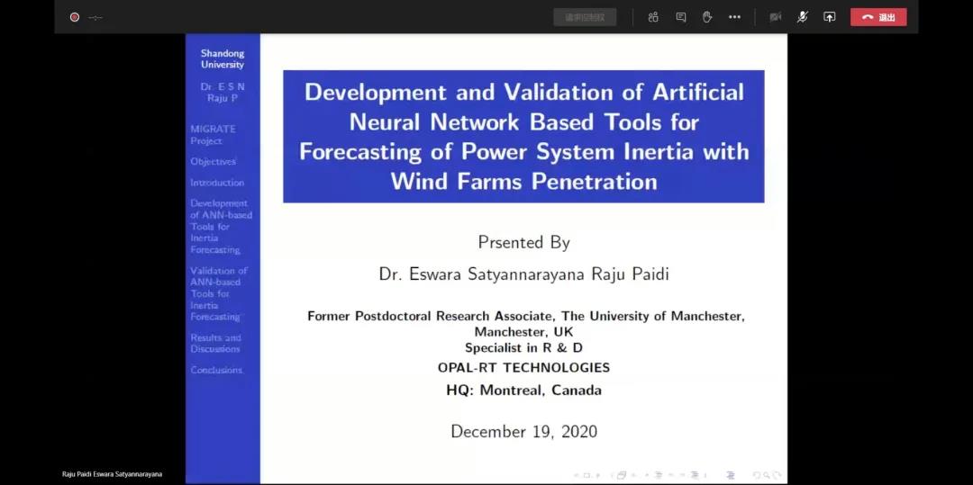 2020年12月19日,低慣量課題組顧問Vladimir Terzija教授邀請印度專家Dr. Raju做關(guān)于慣量預(yù)測的線上報告。