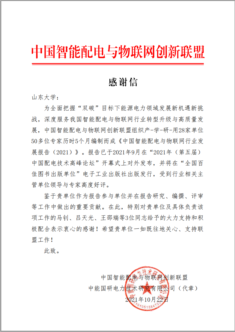 近日,新能源中低壓直流供用電團(tuán)隊收到中國智能配電與物聯(lián)網(wǎng)創(chuàng)新聯(lián)盟的一封感謝信,信中指出山東大學(xué)在《中國智能配電與物聯(lián)網(wǎng)行業(yè)發(fā)展報告(2021)》的研究、編撰、評審等工作中做出了重要貢獻(xiàn),并特別向山東大學(xué)及電氣工程學(xué)院具體負(fù)責(zé)該項工作的新能源中低壓直流配用電團(tuán)隊的馬釗教授等表示了感謝。
