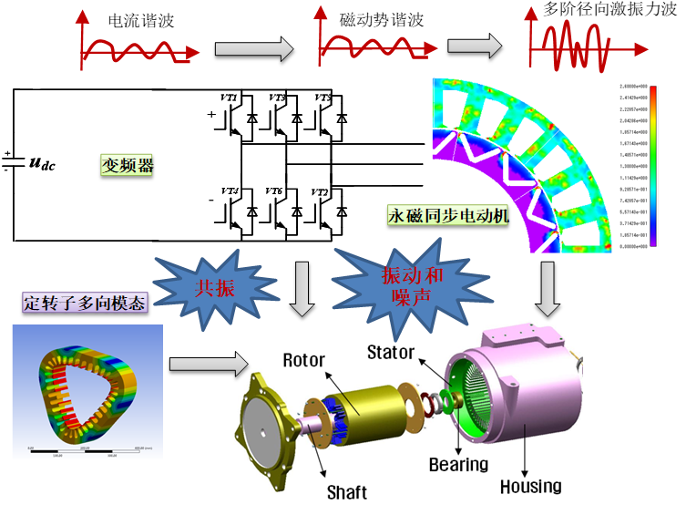 系統(tǒng)研究了多物理因素影響下電磁力波與電機結(jié)構(gòu)參數(shù)和控制參數(shù)的映射規(guī)律,電機結(jié)構(gòu)參數(shù)、變頻器控制參數(shù)和機械電磁共振對振動的協(xié)同作用機制,以及電磁—機械共振的產(chǎn)生機制和穩(wěn)定性判據(jù);以削弱電磁振動為根本目標(biāo),建立了一套綜合考慮電機激振力波、多維模態(tài)耦合和電磁—機械共振的協(xié)同設(shè)計方法,為永磁同步電動機電磁振動的削弱提供理論基礎(chǔ)和技術(shù)支撐。