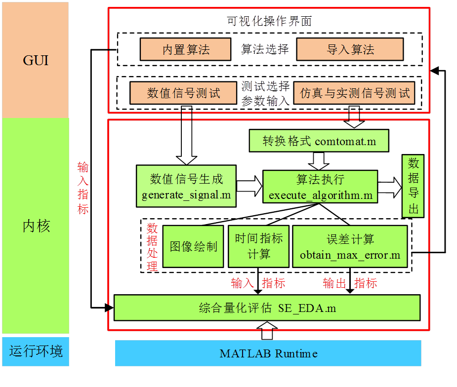 SPEAT是集數(shù)值生成信號(hào)測(cè)試、仿真與實(shí)測(cè)信號(hào)測(cè)試、算法綜合量化評(píng)估一體的軟件應(yīng)用。SPEAT V1.0完全在MATLAB環(huán)境下開(kāi)發(fā),主要包括三個(gè)部分:GUI可視化操作界面、SPEAT 內(nèi)核、Runtime運(yùn)行環(huán)境。GUI將圖形、代碼與內(nèi)置函數(shù)封裝為可視化操作界面以簡(jiǎn)化用戶(hù)輸入并形象顯示測(cè)試結(jié)果。算法選擇模塊提供多種經(jīng)典算法與算法導(dǎo)入接口,測(cè)試選擇模塊具有各類(lèi)數(shù)值信號(hào)測(cè)試、仿真與實(shí)測(cè)信號(hào)測(cè)試類(lèi)型可供用戶(hù)選擇并以對(duì)話(huà)框形式進(jìn)行參數(shù)輸入。測(cè)試選擇模塊鏈接到SPEAT內(nèi)核,執(zhí)行結(jié)果經(jīng)數(shù)據(jù)處理模塊示于可視化界面。待數(shù)值信號(hào)測(cè)試完成后,用戶(hù)可以運(yùn)用效率數(shù)據(jù)包絡(luò)分析工具(SE-EDA)量化評(píng)估算法性能。MATLAB Runtime允許用戶(hù)在未安裝MATLAB的系統(tǒng)上執(zhí)行打包的SPEAT,SPEAT還可部署為Web APP或桌面獨(dú)立應(yīng)用程序。