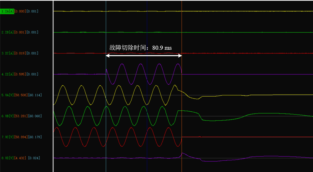 按照試驗(yàn)方案,分別進(jìn)行了中性點(diǎn)不接地方式下單相金屬性接地短路和小電阻接地方式下分別經(jīng)0Ω、100Ω、500Ω、900Ω過(guò)渡電阻的單相接地短路試驗(yàn)。在所實(shí)施的所有短路故障中,兩套保護(hù)裝置的響應(yīng)全部正確;區(qū)內(nèi)故障保護(hù)動(dòng)作時(shí)間為33-51ms,平均39.8ms;故障切除時(shí)間為71-90ms,平均79ms;5G通信端到端延時(shí)平均為10.35ms,保護(hù)裝置端到端通信延時(shí)平均為12.3ms;數(shù)據(jù)傳輸丟包率為0,可靠性為100%;低阻情況下兩端相量同步測(cè)量誤差小于一個(gè)采樣間隔(3º),高阻故障情況下兩端同步誤差不大于兩個(gè)采樣間隔(6º)。