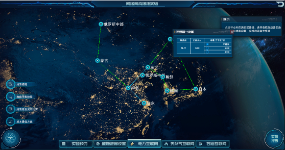 (2)東北亞能源互聯(lián)網(wǎng)網(wǎng)絡架構搭建:通過東北亞能源互聯(lián)網(wǎng)網(wǎng)絡架構搭建仿真實驗,使學生了解東北亞各國的資源稟賦,了解各國不同能源的產(chǎn)需結構,掌握合理規(guī)劃能源傳輸網(wǎng)絡的原理與方法,明確東北亞能源互聯(lián)網(wǎng)的結構特征,形成一定的全球能源配置觀念,通過啟發(fā)式、探究式等多種教學方法,由學生自主設置網(wǎng)絡拓撲與容量,增強學生對于跨國能源互聯(lián)的理解(圖5)。