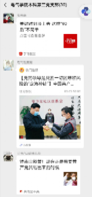 劉欣就習(xí)近平總書記重要講話精神展開,針對疫情期間的相關(guān)輿情進(jìn)行深入分析,并就優(yōu)秀共產(chǎn)黨員的感人事跡分享心得體會,帶領(lǐng)支部黨員以“高視角、高責(zé)任、高知識”面對疫情防控形勢,督促黨員發(fā)揮輻射作用,關(guān)注各類輿情導(dǎo)向,并以意見領(lǐng)袖的角色積極傳播正能量。本科第三黨支部以“黨旗飄飄引領(lǐng)方向,愈難愈克青年擔(dān)當(dāng)”為主題開展抗疫資訊分享活動。會上,支部黨員就自己所分享的抗疫資訊依次展開討論,就戰(zhàn)疫舉措、抗疫英雄、防疫形勢等方面探討青年黨員的責(zé)任與擔(dān)當(dāng)。支部黨員緊密關(guān)注疫情發(fā)展,并積極向群眾傳達(dá)最新講話精神、主動參加志愿者活動、進(jìn)行自愿捐款、開展學(xué)困生幫扶等工作。
