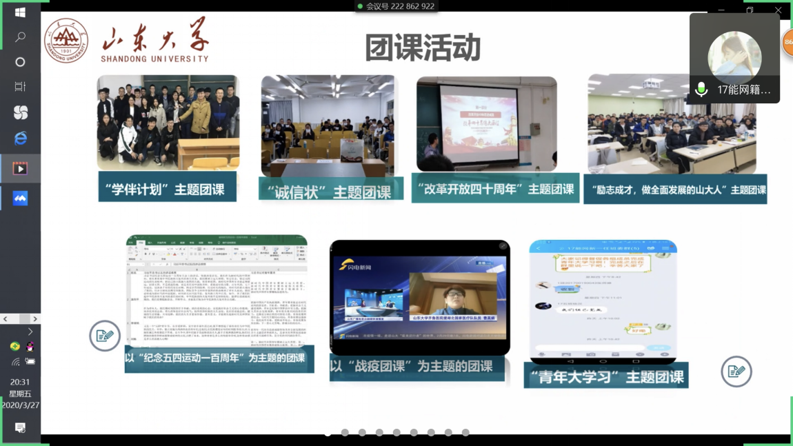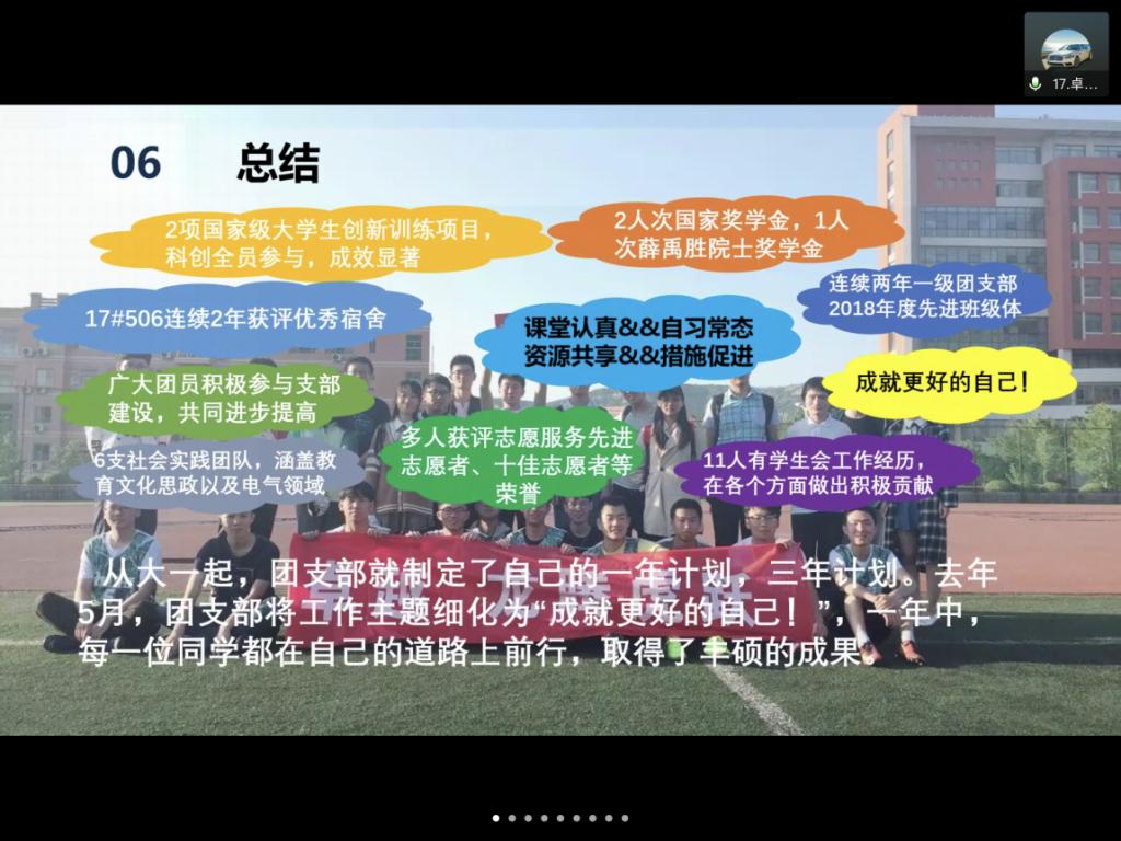 3月27日晚六點半,電氣工程學(xué)院舉行團支部升級達(dá)標(biāo)答辯會,受疫情影響,本次答辯會線上進行。學(xué)院團委書記、16級輔導(dǎo)員邱瑤,17級輔導(dǎo)員陳冠廷,18級輔導(dǎo)員劉寧寧,19級輔導(dǎo)員劉欣出席答辯會,17級、18級和19級的團支部負(fù)責(zé)人悉數(shù)參加。
