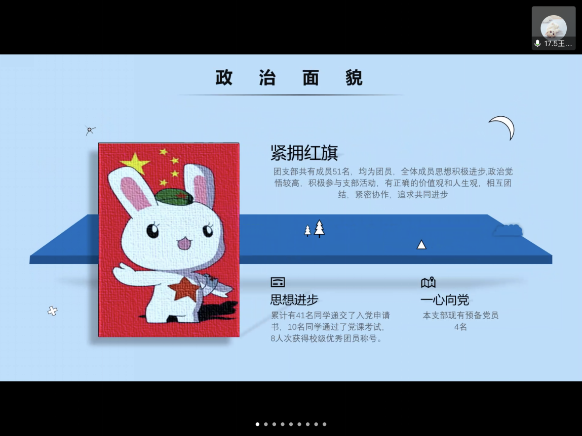各個發(fā)言人答辯完畢后,邱瑤做了最后的點評,從認(rèn)真扎實開展支部活動、學(xué)風(fēng)建設(shè)科創(chuàng)活動重點突出、志服社實穩(wěn)扎穩(wěn)打、文體活動等幾個方面高度評價了各個團支部的工作成果。邱瑤希望通過“達(dá)標(biāo)升級”工作,以評促建,進一步優(yōu)化團的基層組織內(nèi)部機制,規(guī)范基層團支部工作體制,同時,對各團支部提出期望,希望團支書們能在以后的工作中認(rèn)真落實民主評議、三會一課等重要工作。至此,團支部線上升級達(dá)標(biāo)答辯會圓滿結(jié)束。