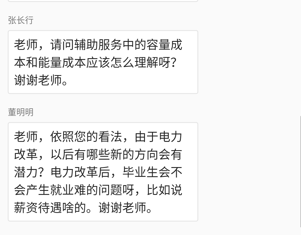 隨后,她結(jié)合實(shí)例介紹了幾項(xiàng)電力市場(chǎng)行業(yè)的新業(yè)態(tài),又結(jié)合自身感受,展望了習(xí)近平總書(shū)記提出的“四個(gè)革命、一個(gè)合作”的能源安全新戰(zhàn)略。最后,同學(xué)們利用留言功能踴躍地提出了許多有關(guān)個(gè)人發(fā)展、市場(chǎng)前景、國(guó)家政策等方面的問(wèn)題,林華細(xì)致地依次給予解釋?zhuān)€留下了自己的聯(lián)系方式以便學(xué)生們向她咨詢(xún)問(wèn)題。