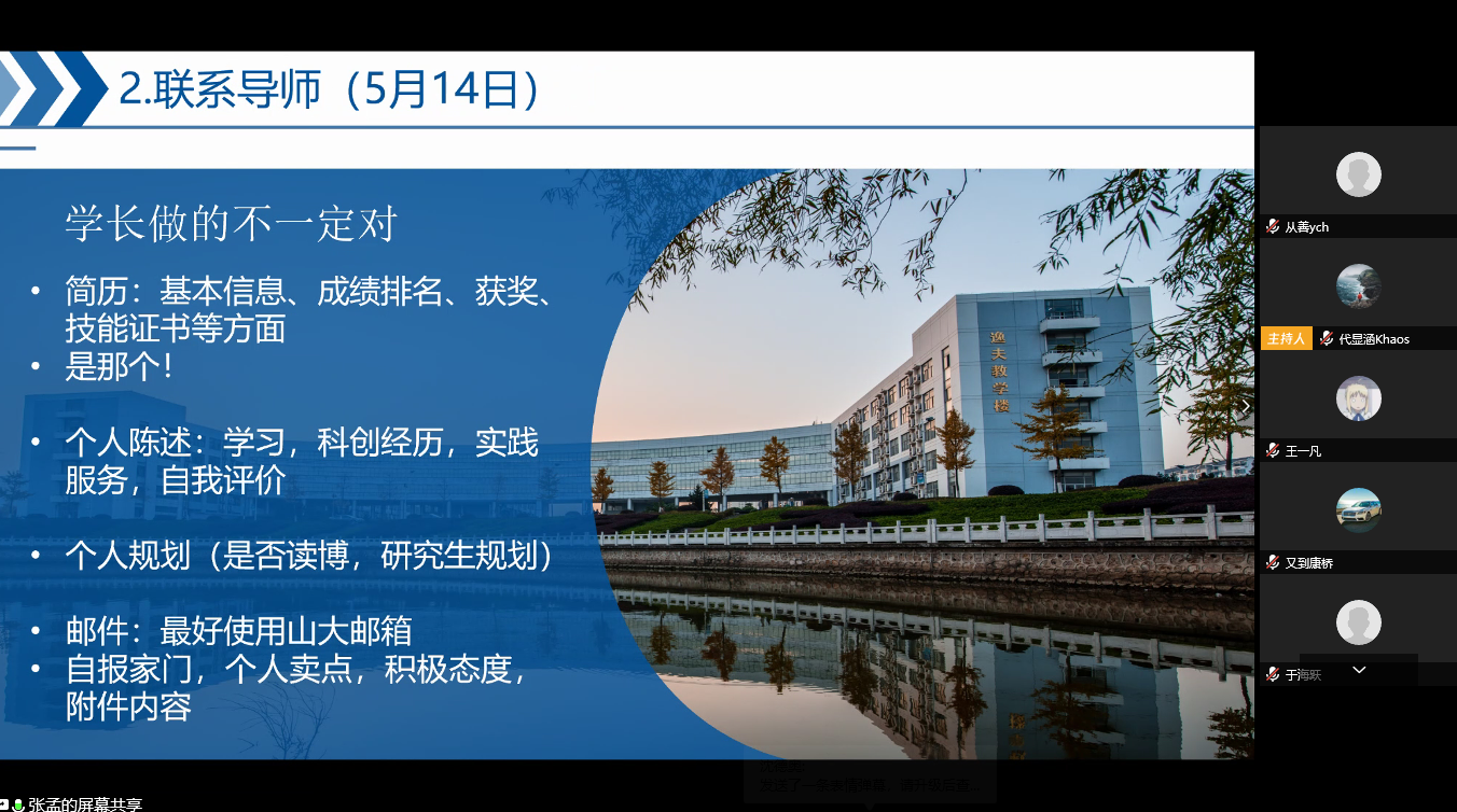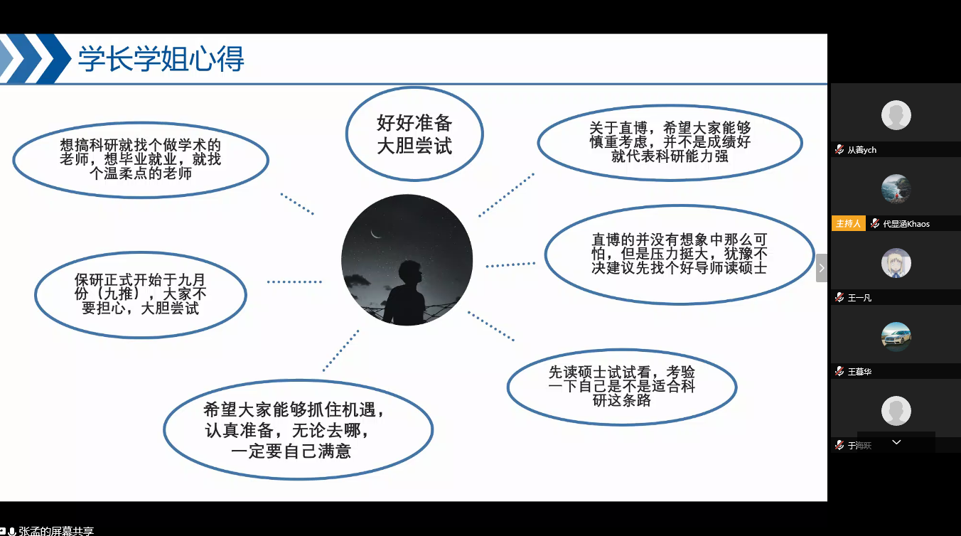 活動(dòng)開始前,主持人首先簡要介紹了學(xué)長學(xué)姐成功保研的院校,并提醒與會(huì)同學(xué)遵守線上會(huì)議的相關(guān)要求。隨后,經(jīng)驗(yàn)交流會(huì)開始,四位學(xué)生對(duì)自己在保研過程中的收獲進(jìn)行分享和總結(jié)。