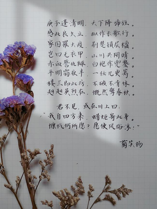 工科生亦有筆墨詩懷。在清明國祭日之時(shí),藺笑揚(yáng)同學(xué)寫就一篇仿古《長歌行》,遙寄戰(zhàn)疫英烈。摘此一段,以饗諸君。亦有劉郅晨同學(xué)寫一封信箋以寄心思。