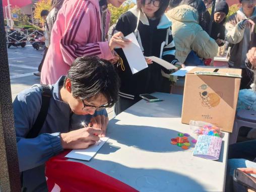 活動(dòng)現(xiàn)場(chǎng)劃分為“荷包DIY”“明信片DIY”與“詩韻闖關(guān)”三大互動(dòng)區(qū)域,吸引了眾多學(xué)生參與。同學(xué)們?cè)谟螒蛑懈惺芪幕攘Γ诨?dòng)中傳遞關(guān)懷力量,整場(chǎng)活動(dòng)洋溢著溫暖而真摯的氛圍。