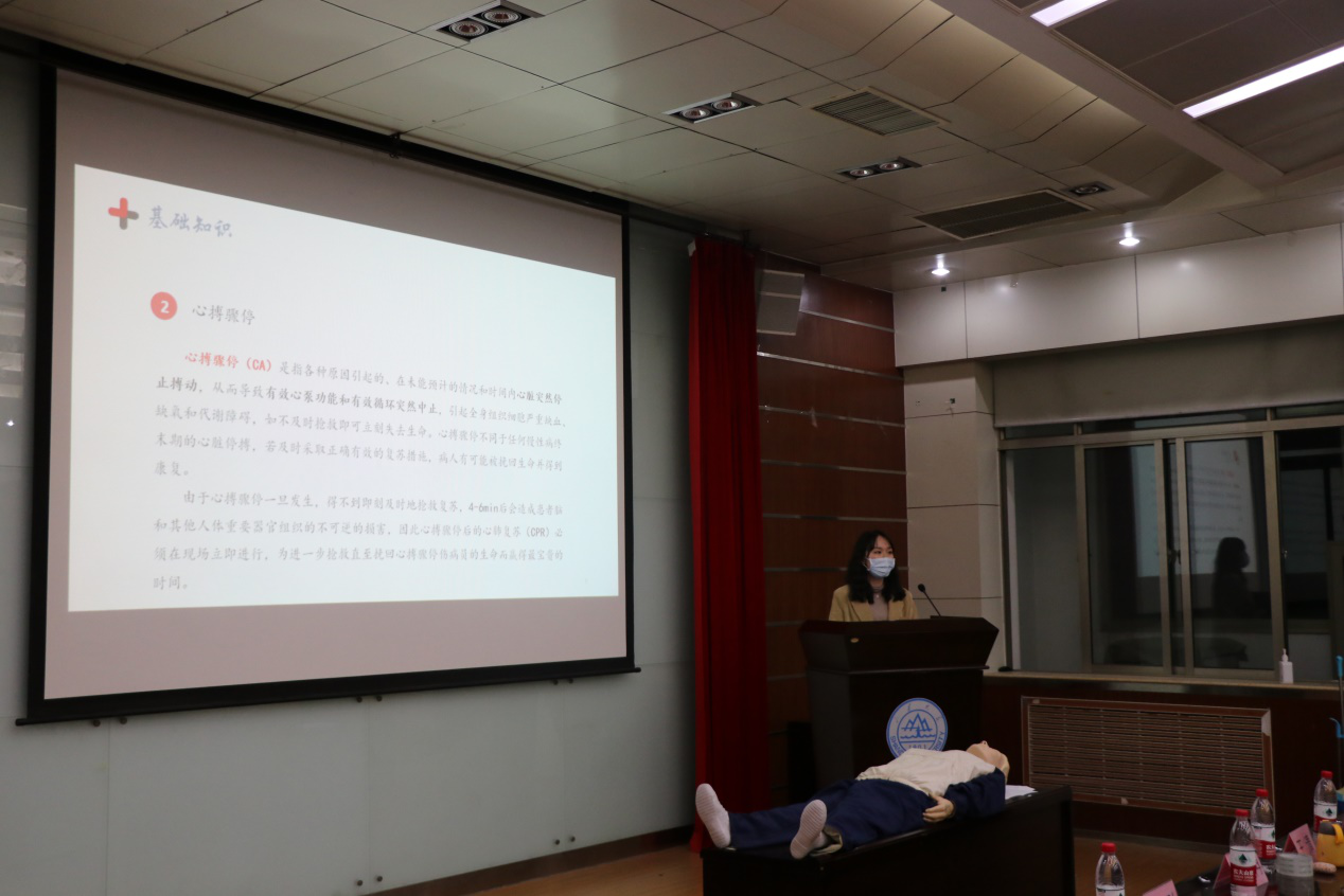 接著,護理學院的王清和盧冉冉同學就心肺復蘇的基礎知識、操作步驟以及AED(自動體外除顫器)進行了簡單介紹,以一部名叫“生命快車”的公益視頻解釋了黃金四分鐘的重要性,重點講解了心肺復蘇的整個流程,并實地進行演示。