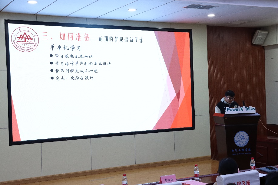 隨后,張永浩以“如何準備智能車競賽”為主題,從比賽簡介、小組分工、準備工作以及心得體會等方面詳細講述了如何充分地準備一場智能車比賽。他提到,兩次參賽經(jīng)歷不僅讓他掌握了專業(yè)知識,更讓他結(jié)交了一群一起努力拼搏、相互鼓舞的朋友。他在準備比賽的過程中學(xué)會了合作溝通、求同存異,領(lǐng)會了奉獻精神、傳承精神,這些經(jīng)歷對他的影響意義非凡。