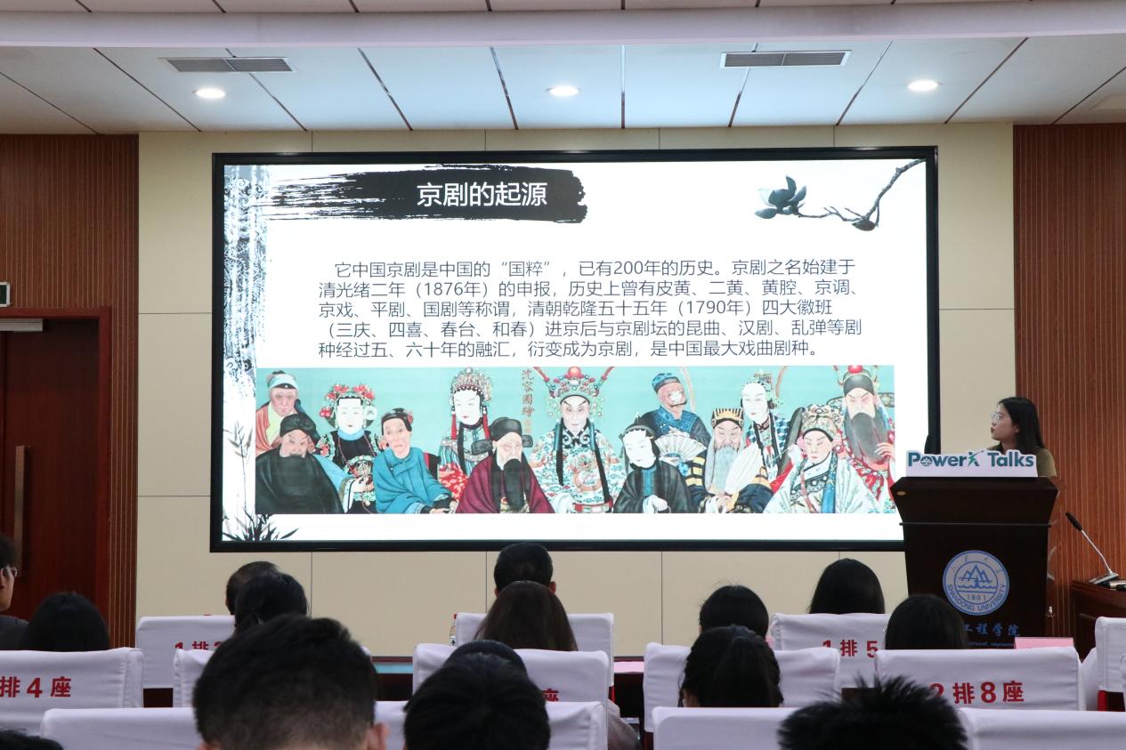 楚夢涵以“國粹京劇”為關(guān)鍵詞,生動地介紹了京劇的起源和基本概況,并分享了她與京劇的故事。以《穆桂英掛帥》、《雙陽公主》等經(jīng)典京劇作品為例,楚夢涵用富有趣味的方式向大家展示了京劇的幾類流派以及不同流派的特點(diǎn)和代表作,使同學(xué)們感受到了京劇唱腔、唱段、身段、武打等多方面的藝術(shù)之美。