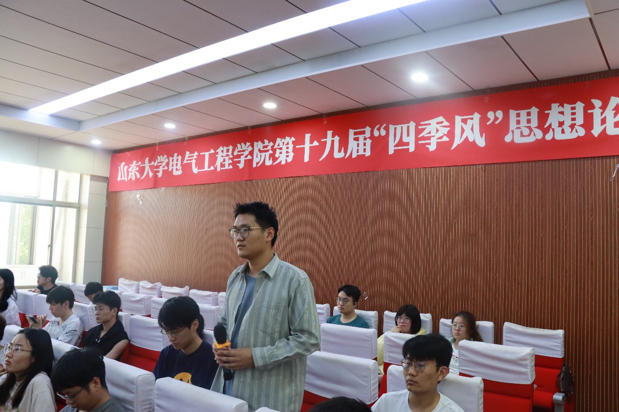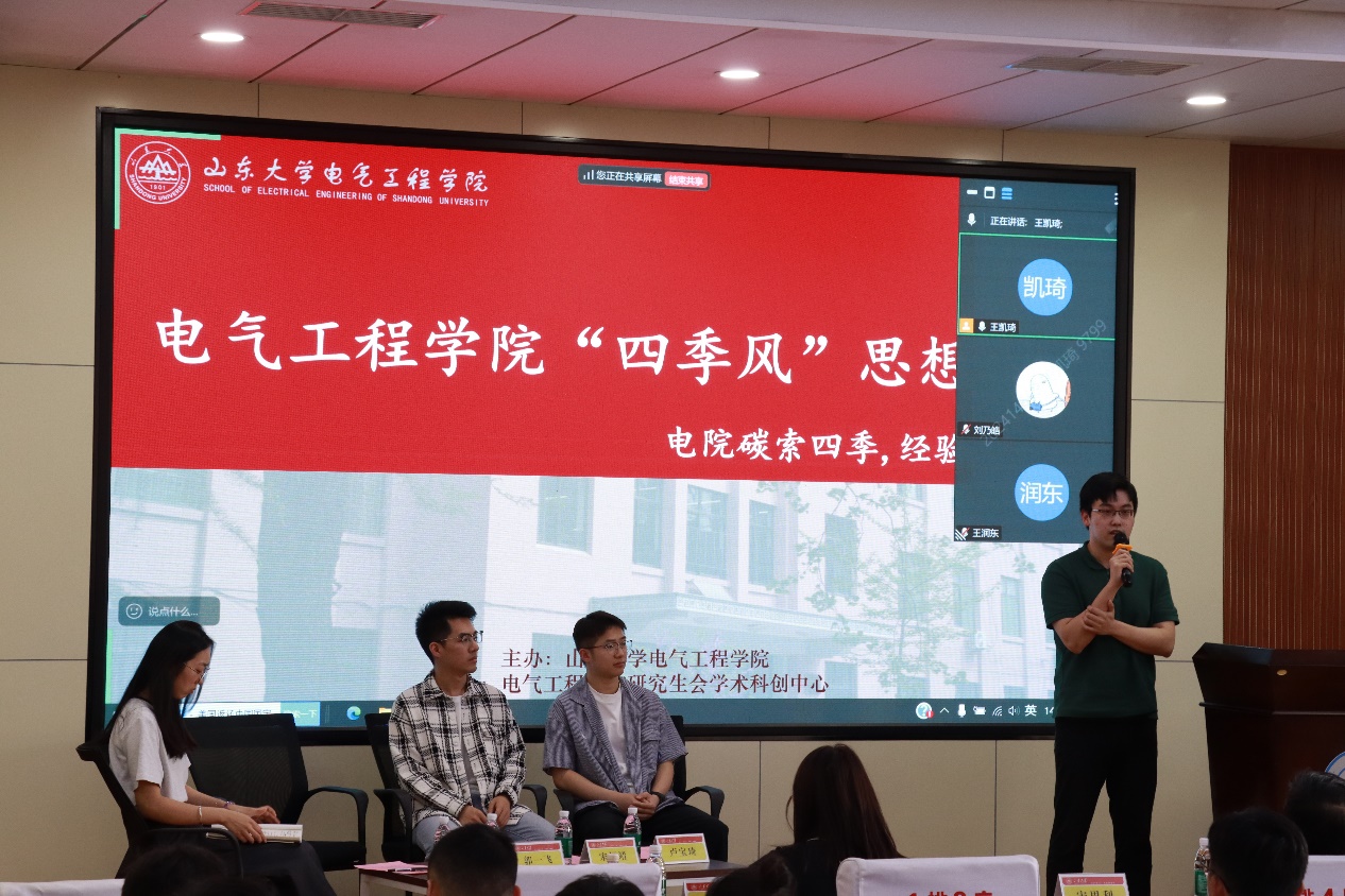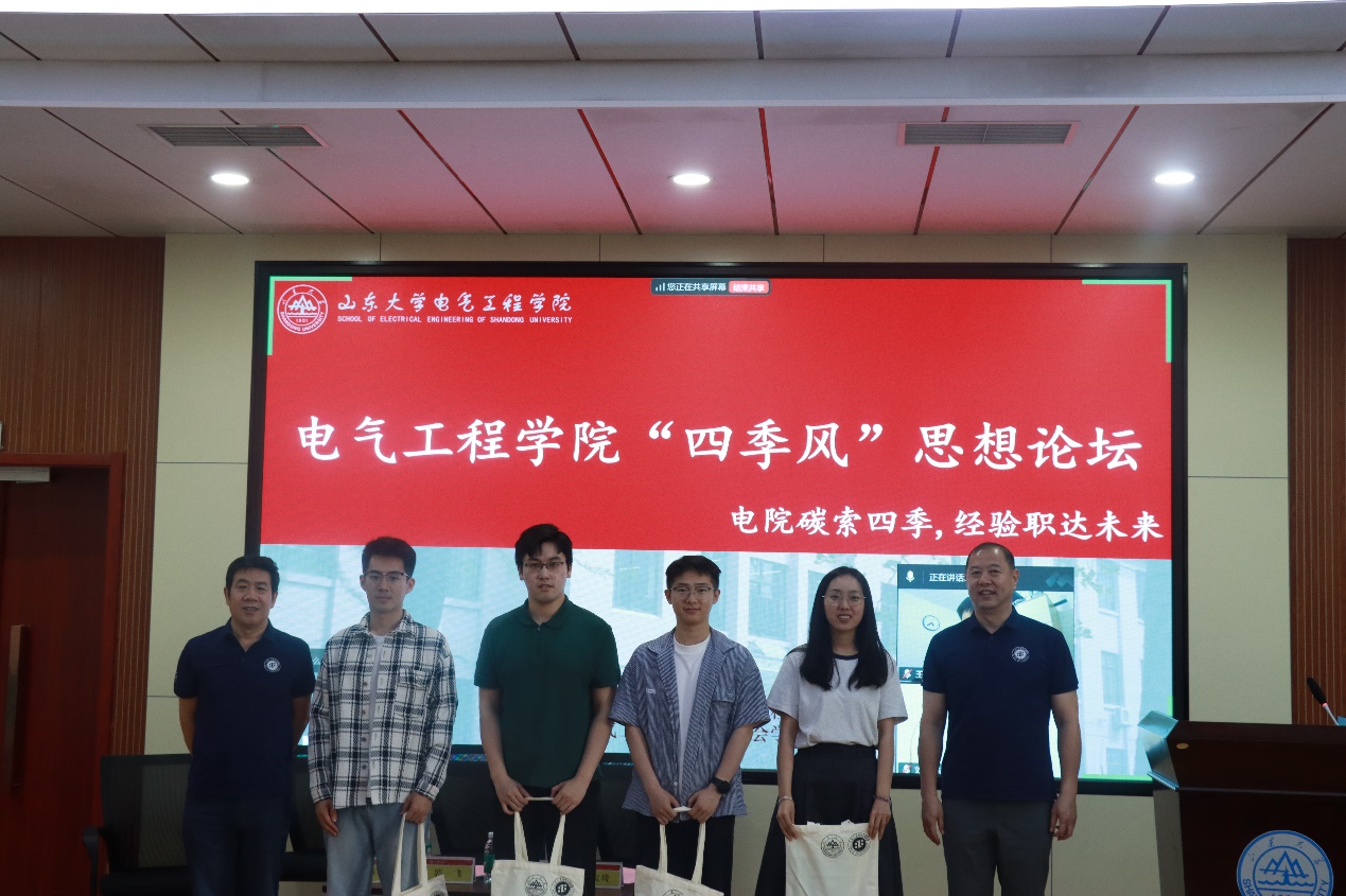 5月17日下午,第十九屆“四季風(fēng)”青年師生思想論壇在電力樓四樓報告廳成功舉辦。本次論壇由電氣工程學(xué)院研究生會學(xué)術(shù)科創(chuàng)中心主辦,緊扣“電院碳索四季,經(jīng)驗(yàn)職達(dá)未來”主題,邀請到青年學(xué)者郭一飛與五位本院優(yōu)秀碩士畢業(yè)生盧寶琦、宋福靖、劉乃皓、王潤東、楊東華為主講人,以線上線下結(jié)合的形式開展。山東大學(xué)電氣工程學(xué)院黨委副書記宋思利、研究生思政辦公室主任宋濟(jì)平、研究生輔導(dǎo)員唐曉曼出席本次論壇。論壇由學(xué)院研究生會學(xué)術(shù)與科創(chuàng)中心王凱琦主持。