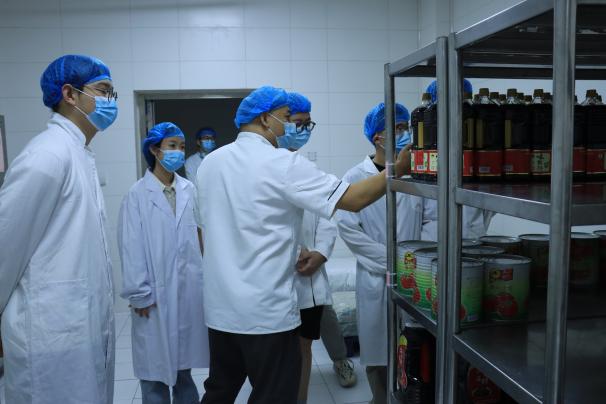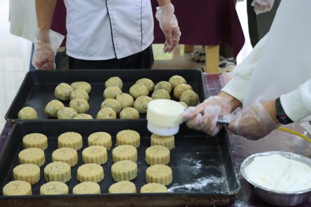活動(dòng)現(xiàn)場,工作人員以印有月亮、玉兔等元素的中秋主題心愿卡為參與學(xué)生分組,小組成員們通過2-3分鐘自我介紹快速熟絡(luò)。隨后,食堂師傅現(xiàn)場演示月餅制作步驟,重點(diǎn)講解餅皮厚度控制、餡料大小、防外露等技巧,同學(xué)們?cè)趲煾抵笇?dǎo)下分工協(xié)作,共同完成五仁與芒果提子兩種餡料的月餅制作與壓模定型。隨后,食堂師傅將月餅送入烤箱,主持人組織破冰活動(dòng)活躍現(xiàn)場氛圍,來自不同專業(yè)的學(xué)生通過趣味游戲進(jìn)行故事分享、經(jīng)驗(yàn)交流,現(xiàn)場氛圍輕松熱烈。在此期間,參與成員也跟隨食堂經(jīng)理的腳步,走進(jìn)了舜園食堂的后廚操作區(qū),實(shí)地探訪了月餅從原料到成品的誕生過程,親身感受了食堂在食品安全管理上的嚴(yán)謹(jǐn)與細(xì)致。待月餅冷卻后,同學(xué)們將親手制作的月餅分裝帶走,與老師、好友分享團(tuán)圓滋味。