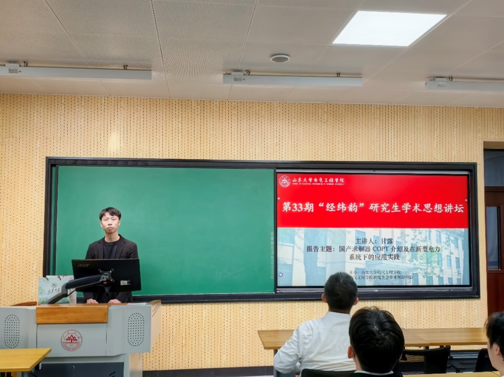 12月3日,電氣工程學(xué)院第33期“經(jīng)緯韻”研究生學(xué)術(shù)思想講壇在千佛山校區(qū)6號(hào)樓330教室成功舉辦。電氣工程學(xué)院李正爍教授邀請(qǐng)到杉數(shù)科技電力能源業(yè)務(wù)顧問(wèn)甘露,以“國(guó)產(chǎn)求解器COPT介紹及在新型電力系統(tǒng)下的應(yīng)用實(shí)踐”為主題開(kāi)展分享。