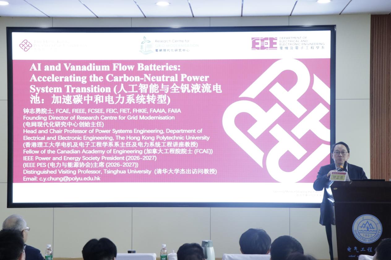 接下來(lái),鐘志勇院士帶來(lái)題為《人工智能與全釩液流電池:加速碳中和電力系統(tǒng)轉(zhuǎn)型》的學(xué)術(shù)報(bào)告。報(bào)告以全球碳中和目標(biāo)下的電力系統(tǒng)轉(zhuǎn)型需求為切入點(diǎn),梳理了“雙碳”背景下傳統(tǒng)電力系統(tǒng)的核心痛點(diǎn),重點(diǎn)聚焦人工智能(AI)與全釩液流電池(VRB)儲(chǔ)能兩大關(guān)鍵技術(shù)的創(chuàng)新應(yīng)用及協(xié)同價(jià)值。鐘志勇指出,AI技術(shù)已在電力系統(tǒng)的負(fù)荷預(yù)測(cè)、設(shè)備監(jiān)測(cè)、系統(tǒng)運(yùn)行、穩(wěn)定性分析等多場(chǎng)景實(shí)現(xiàn)突破,通過(guò)與物理知識(shí)融合提升決策的可解釋性與可靠性,為電網(wǎng)智能化升級(jí)提供核心支撐;VRB憑借安全可靠、長(zhǎng)壽命、易回收的技術(shù)優(yōu)勢(shì),與輸電網(wǎng)協(xié)同規(guī)劃可有效降低投資成本,提升可再生能源消納能力,破解新能源波動(dòng)性難題。
