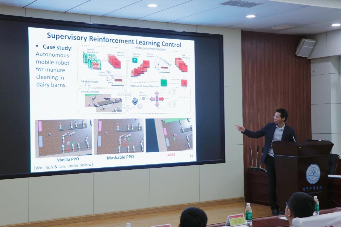 藍(lán)江林教授提出“學(xué)習(xí)與控制理論融合”的創(chuàng)新路徑,分享了數(shù)據(jù)驅(qū)動(dòng)模型預(yù)測(cè)控制、兩級(jí)強(qiáng)化學(xué)習(xí)模型預(yù)測(cè)控制等核心技術(shù)。針對(duì)混合車(chē)輛隊(duì)列控制難題,數(shù)據(jù)驅(qū)動(dòng)模型預(yù)測(cè)控制可有效應(yīng)對(duì)人類(lèi)駕駛行為的不確定性,相較于傳統(tǒng)自適應(yīng)巡航控制系統(tǒng)(ACC),能有效規(guī)避碰撞風(fēng)險(xiǎn);在環(huán)島交互駕駛的復(fù)雜場(chǎng)景中,兩級(jí)強(qiáng)化學(xué)習(xí)模型預(yù)測(cè)控制可將碰撞率降至1%-2%,顯著優(yōu)于主流算法;面向奶牛場(chǎng)清糞的實(shí)際作業(yè)場(chǎng)景,其團(tuán)隊(duì)研發(fā)的糞便清潔機(jī)器人監(jiān)督強(qiáng)化學(xué)習(xí)方案,通過(guò)全局進(jìn)化調(diào)度與自適應(yīng)執(zhí)行器的協(xié)同配合,實(shí)現(xiàn)了安全高效自主作業(yè)。
